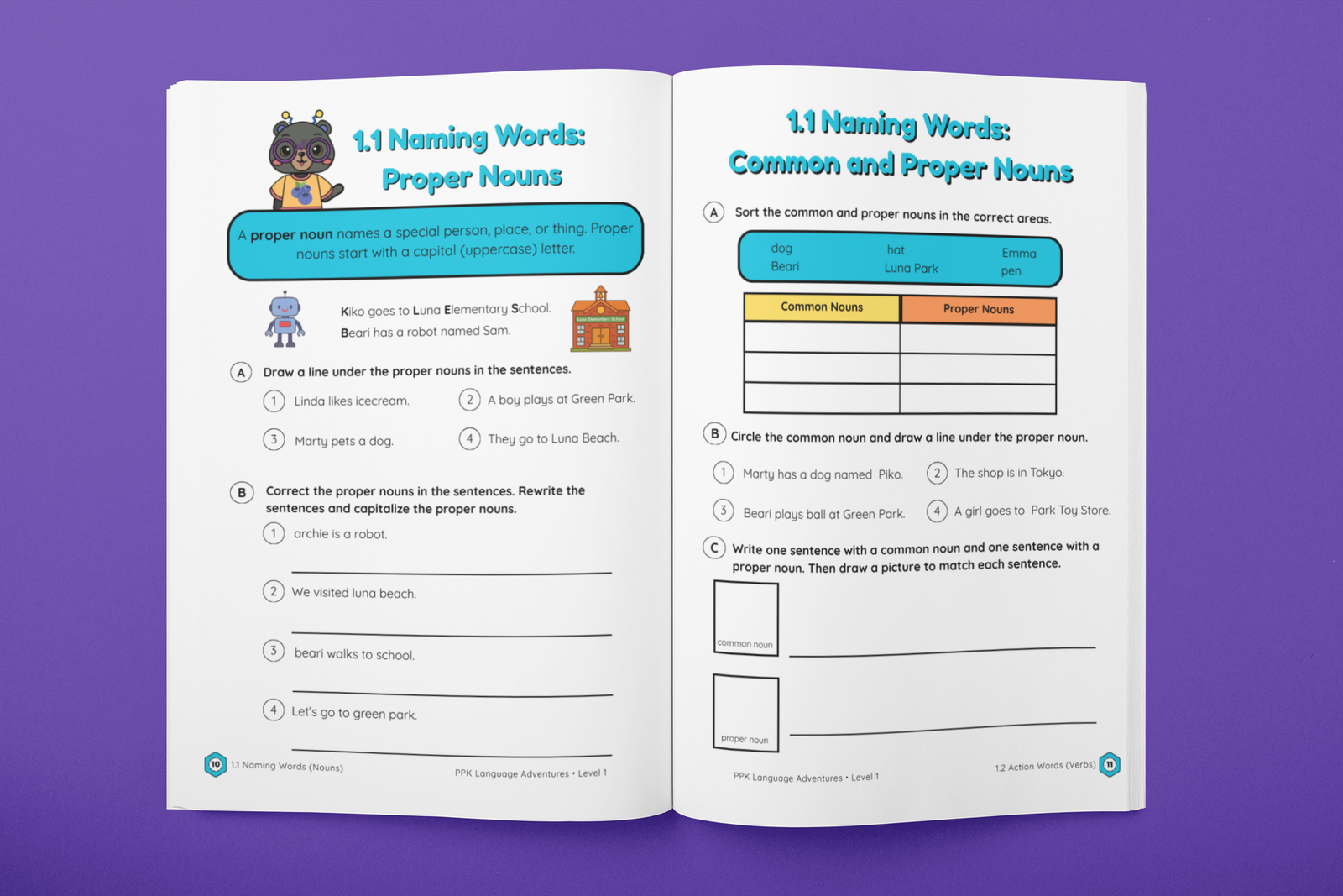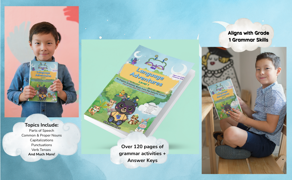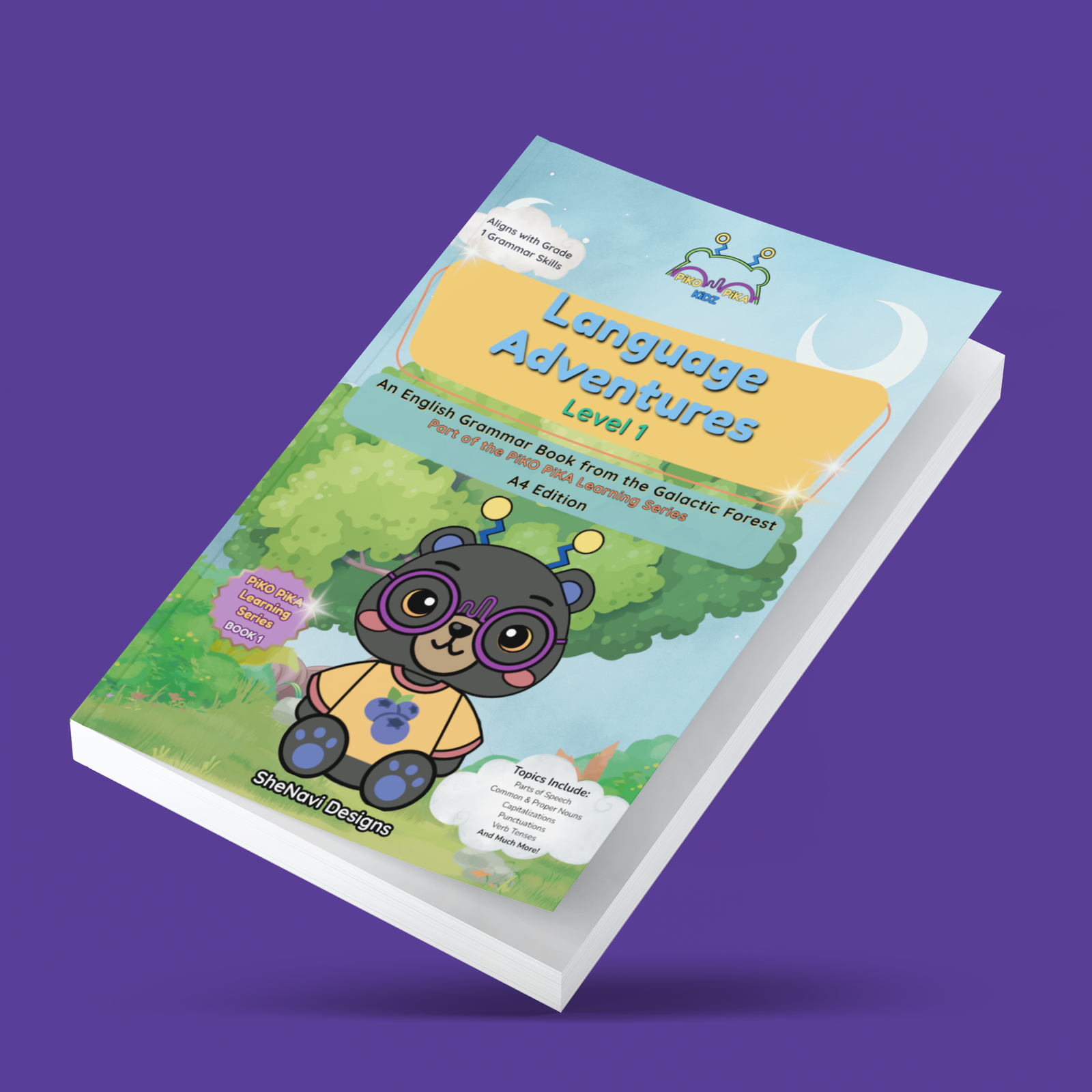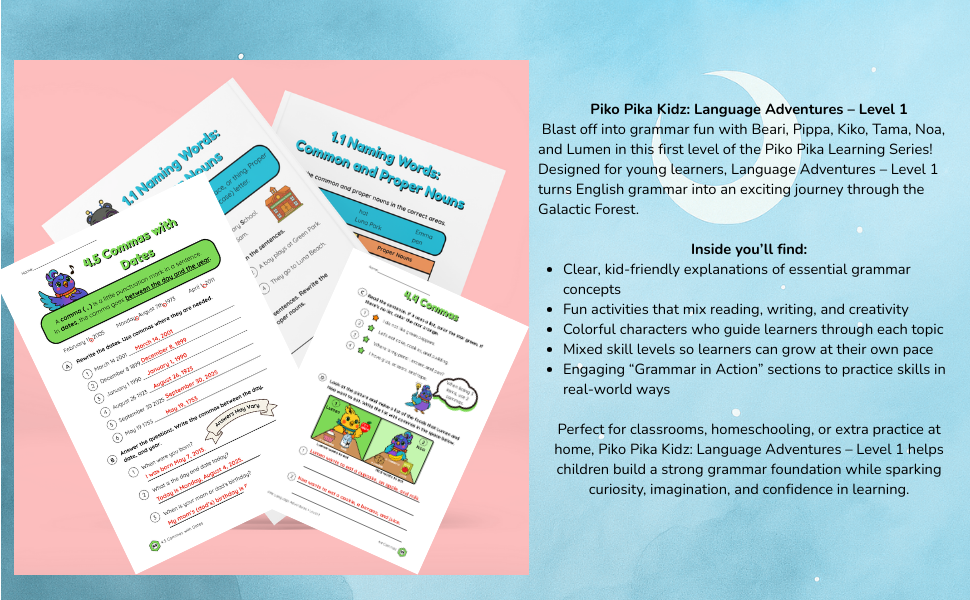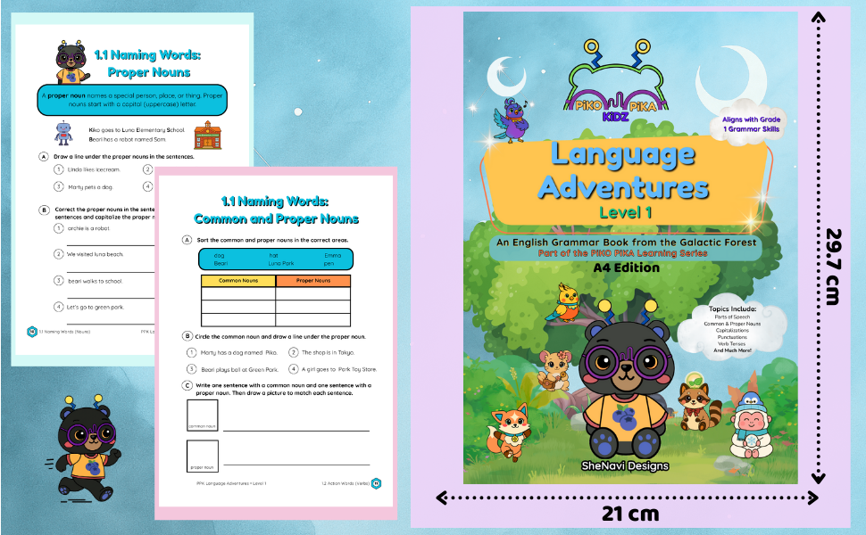 Blast off into grammar fun with Beari, Pippa, Kiko, Tama, Yuki, Noa, and Lumen in this first level of the Piko Pika Learning Series! Designed for young learners, Language Adventures – Level 1 turns English grammar into an exciting journey through the Galactic Forest.