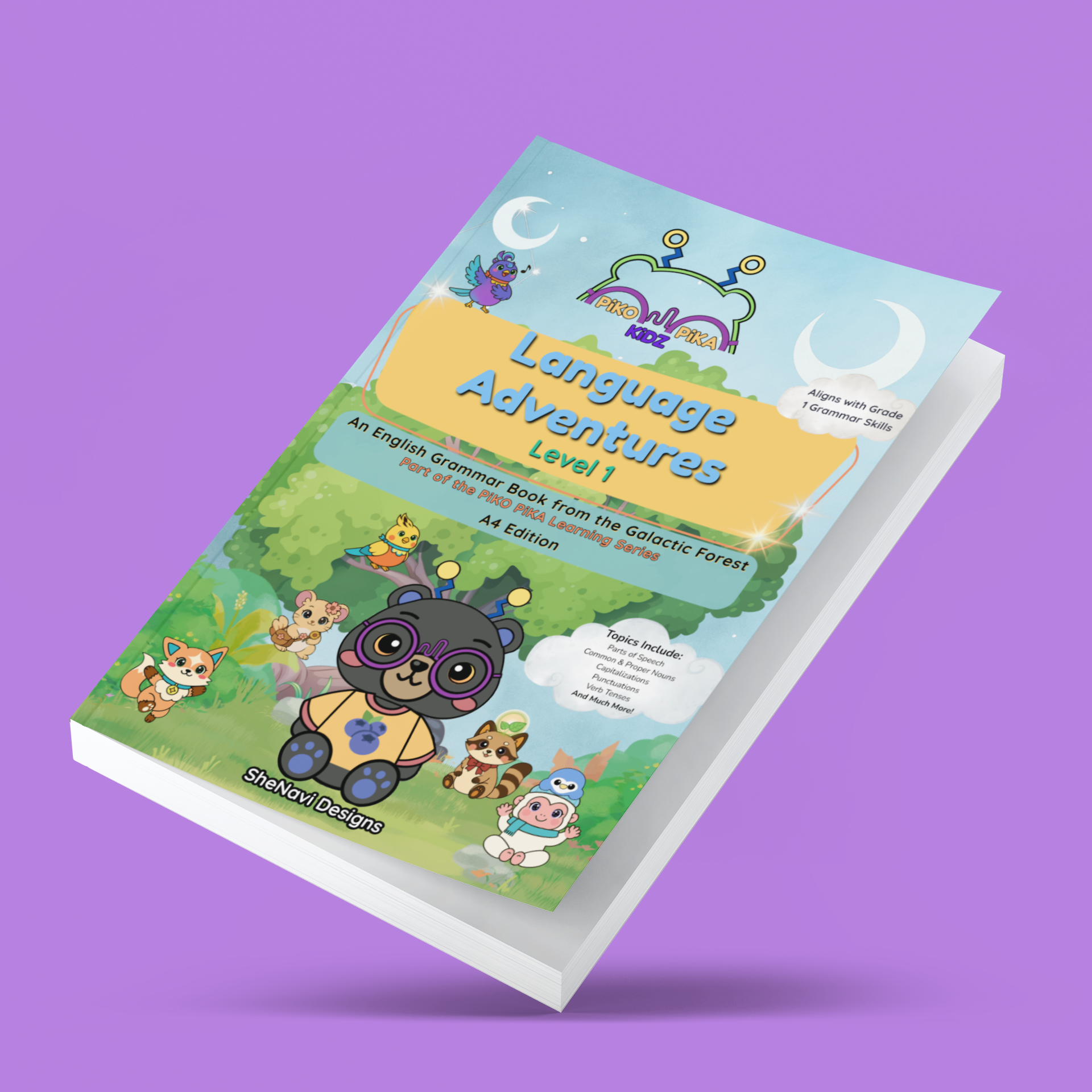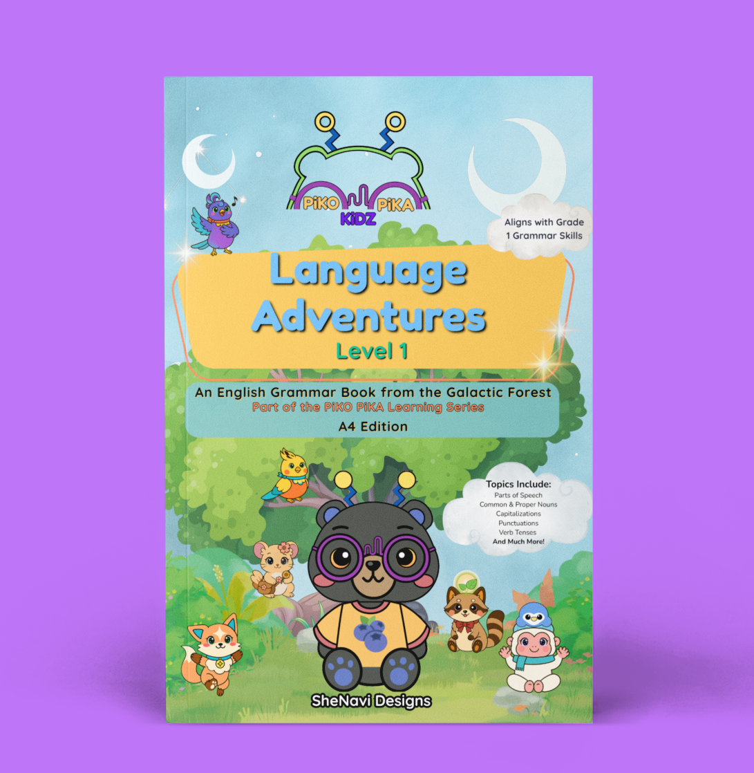 Blast off into grammar fun with Beari, Pippa, Kiko, Tama, Yuki, Noa, and Lumen in this first level of the Piko Pika Learning Series! Designed for young learners, Language Adventures – Level 1 turns English grammar into an exciting journey through the Galactic Forest.