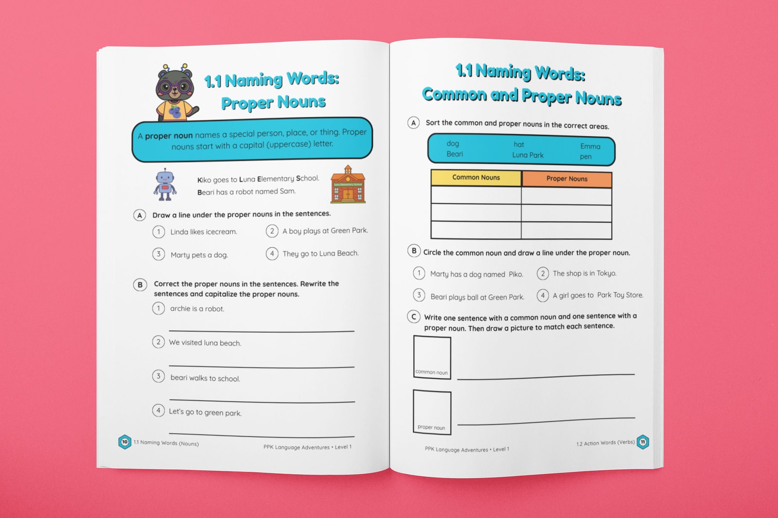 Blast off into grammar fun with Beari, Pippa, Kiko, Tama, Yuki, Noa, and Lumen in this first level of the Piko Pika Learning Series! Designed for young learners, Language Adventures – Level 1 turns English grammar into an exciting journey through the Galactic Forest.